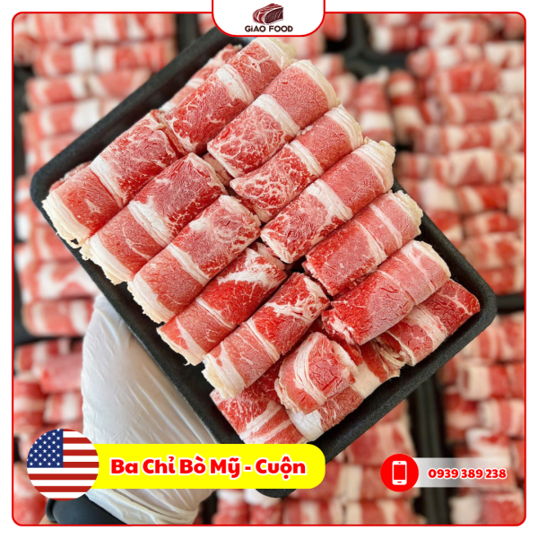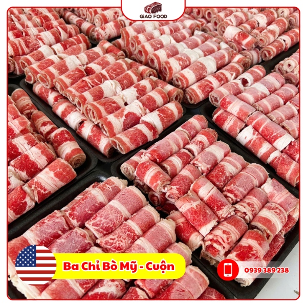 - Ba chỉ bò Mỹ cuộn tròn đẹp mắt, thích hợp cho món cuộn nấm kim châm, nướng phô mai, lẩu.