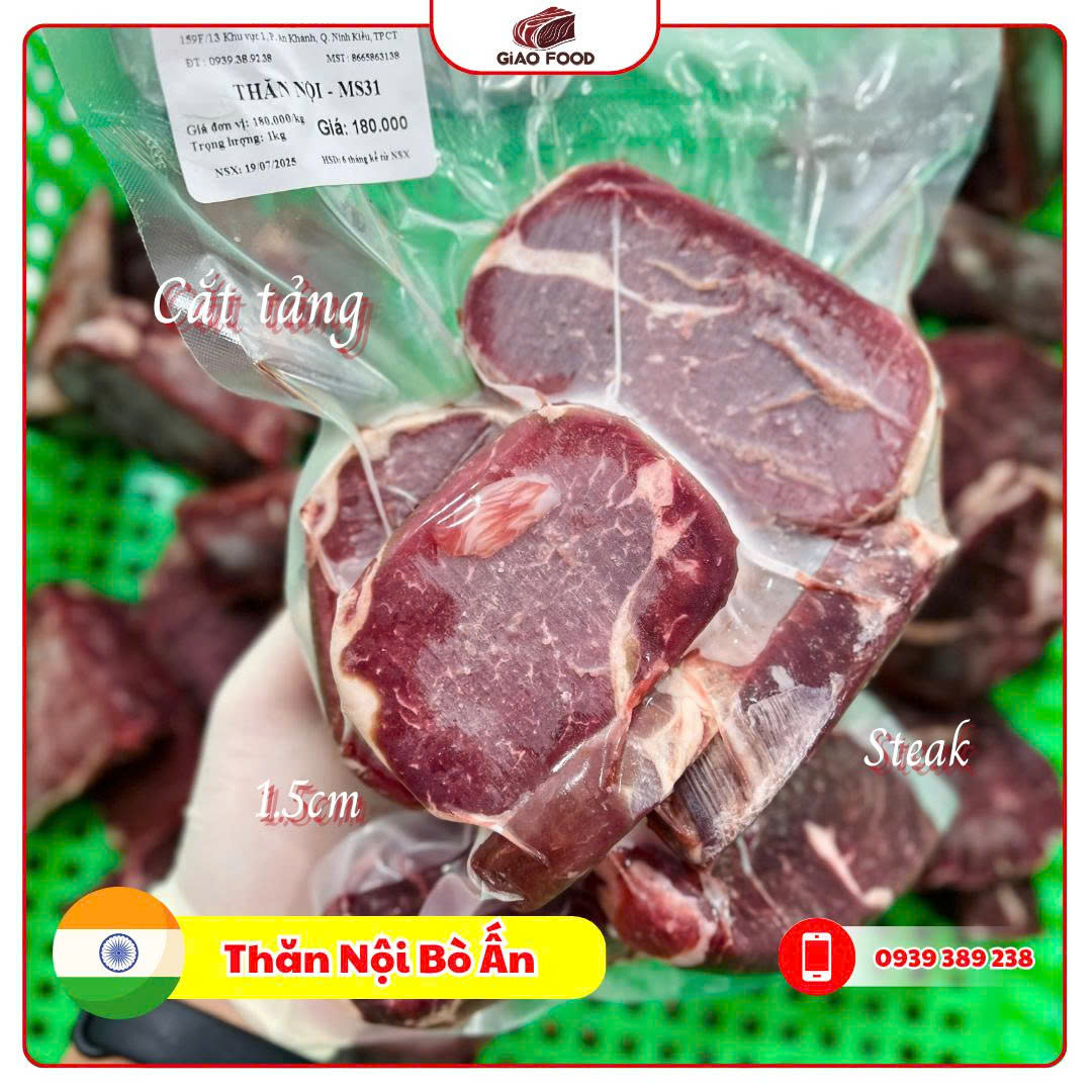 - Thăn nội bò Ấn là phần thịt mềm nhất, không gân, không mỡ, được cắt dày 1.5cm cho miếng thịt dày dặn, mềm tan khi chế biến.